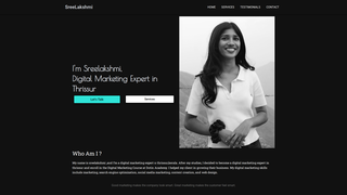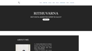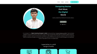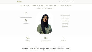 The website presents a professional services-focused brand led by a marketing and digital content specialist who highlights capabilities in social media strategy, campaign execution, and data-driven performance across platforms. It communicates a clear audience for brands seeking strategic marketing, brand storytelling, and measurable digital advertising outcomes.